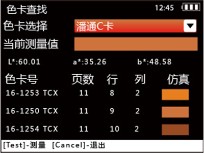 三、對目標顏色進行測量,儀器將目標顏色與顏色庫中的顏色進行對比,選取三種顏色相近的顏色,每個顏色代表一個CMYK值;