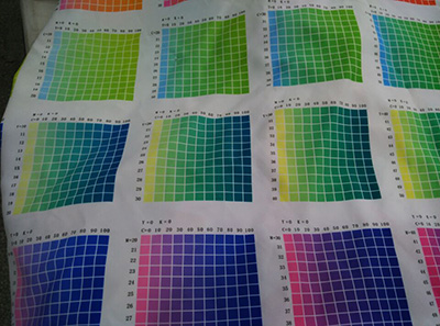 確定印刷旗幟的顏色是通過CMYK值,首先將不同CMYK的顏色進行打樣(如圖2),將需要印刷的潘通色卡與樣品對比,尋找出相近顏色所對應(yīng)的CMYK,最后將CMYK值輸入電腦進行配色打印。