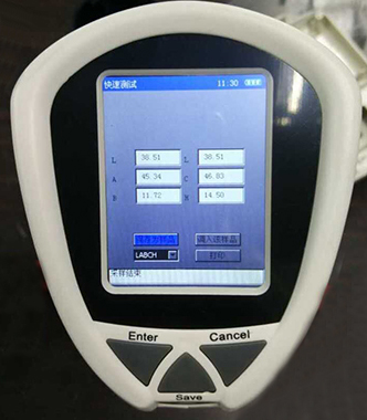 步驟五:按“Enter”鍵進(jìn)入“試樣測量”頁面。再按“Test”鍵測試,“嘀”聲后完成色差測量,顯示色差結(jié)果。