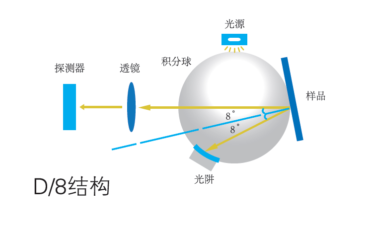1、儀器采用國際通用的D/8(積分球漫射照明,8&deg;觀察角)SCI照明觀測條件