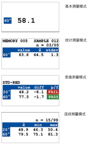 連續(xù)測(cè)量模式是快速檢查大面積樣品的均質(zhì)性最有效的方 法。您確定好測(cè)量間隔后將微型光澤儀在樣品上持續(xù)滑行, 即刻得到連續(xù)測(cè)量結(jié)果。測(cè)量結(jié)束后,屏幕顯示平均值、最 大/最小值的范圍。