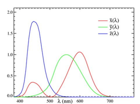 是CIE1931標準色度觀察者的光譜三刺激值,即圖2中的曲線值。k是歸一化系數(shù),物理意義是將光源的Y值歸一化為100,其計算公式為: